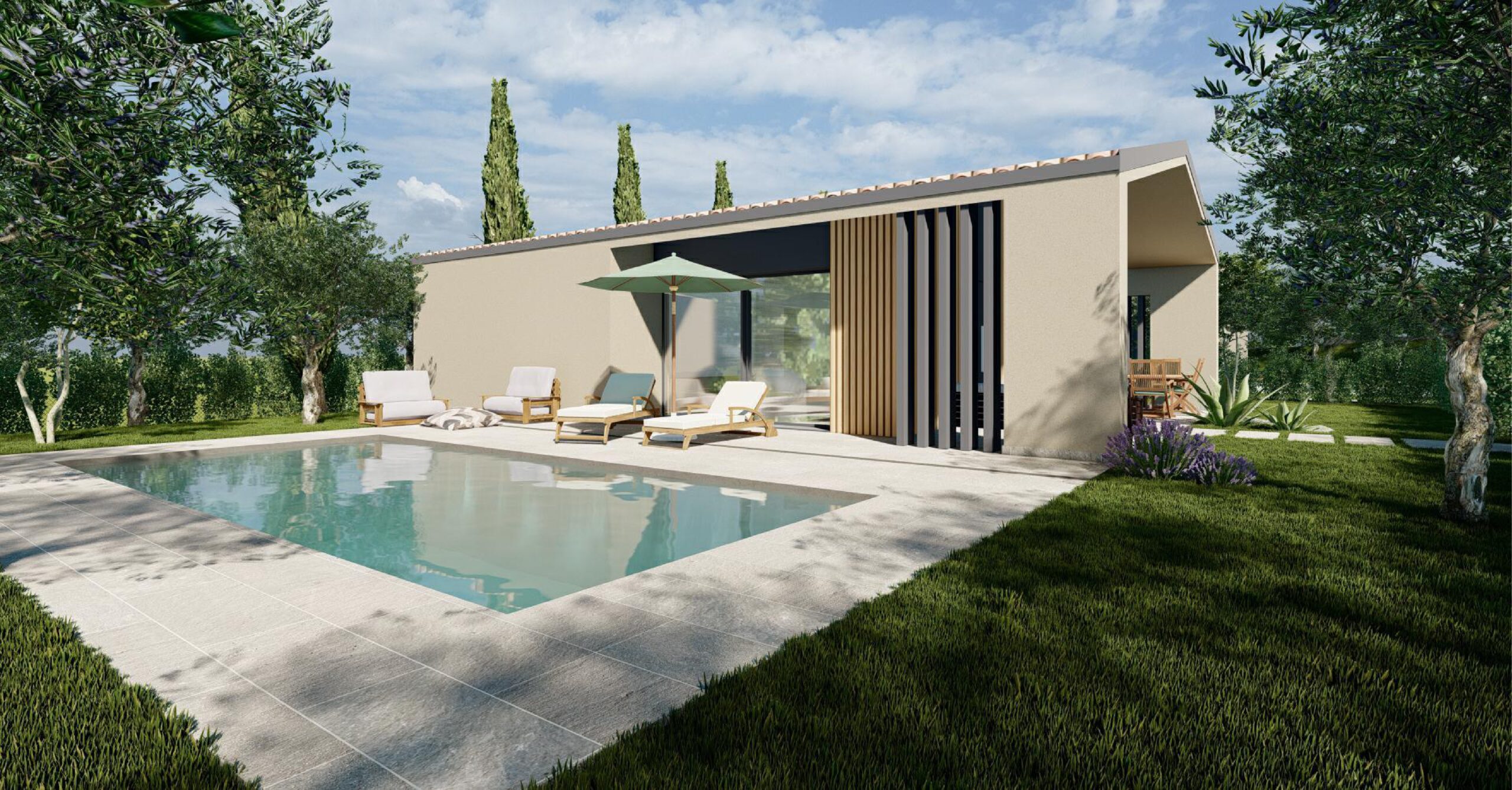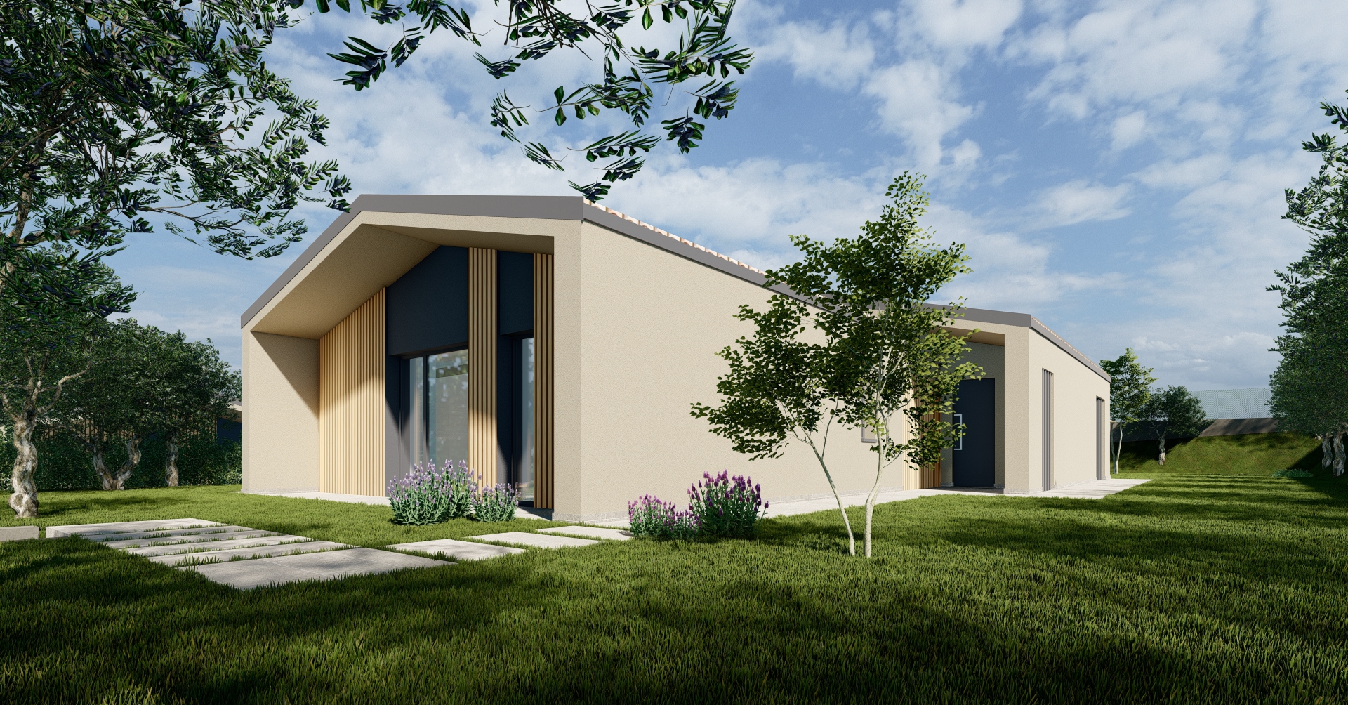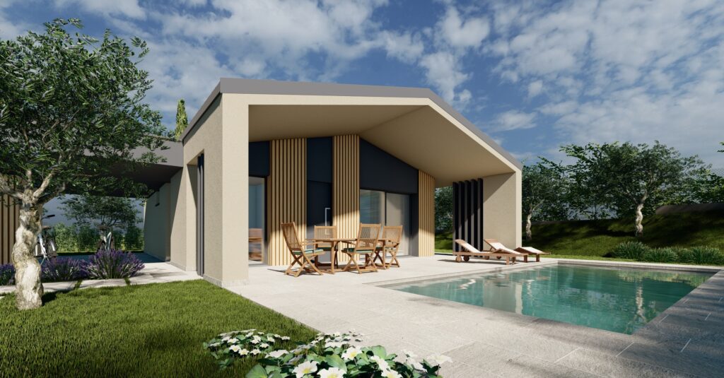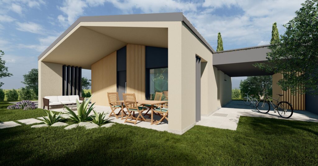 Gli edifici si sviluppano su un unico livello, scelta progettuale che privilegia continuità degli spazi e qualità dell’abitare. Il cuore della casa è una zona living ampia e luminosa, in cui cucina e area pranzo si affacciano verso l’esterno attraverso grandi superfici vetrate. Il portico diventa così una naturale estensione degli interni, uno spazio intermedio che accompagna verso il giardino.