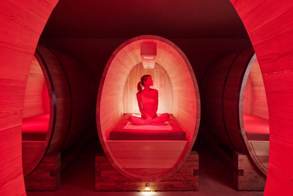 Facciamo un’altra deviazione, questa volta nell’entroterra bresciano, per scoprire QC Terme Garda, gruppo che vanta uno studio di progettazione interno. Qui l’architettura è al servizio dell’esperienza sensoriale: l’edificio principale, ristrutturato con grande rispetto per il contesto storico e ambientale, accoglie gli ospiti in ambienti che alternano atmosfere rustiche e dettagli contemporanei. L’utilizzo del legno, della pietra locale e di ampie vetrate crea un equilibrio tra intimità e apertura, invitando a rallentare e godere della luce naturale che filtra nei diversi spazi.