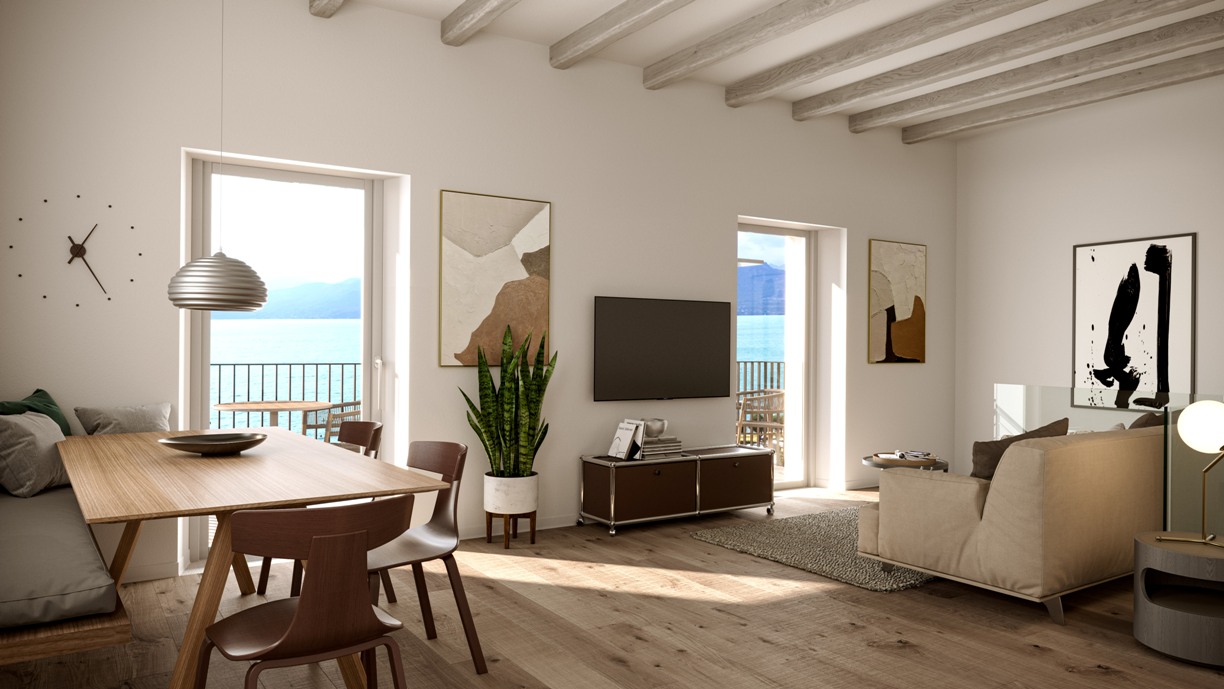 Inside, the most striking feature is the relationship with light. The large full height windows have been designed to turn the lake view into the main furnishing element. High ceilings with whitewashed exposed beams and the use of natural materials create airy and warm spaces, perfect for those who wish to experience Lake Garda in total relaxation.