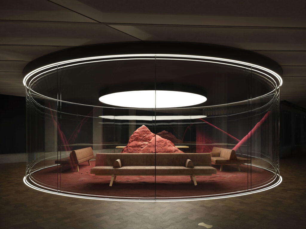 UniFor presenta Non Places, un allestimento di Studio Klass che rompe con i canoni tradizionali. All’interno di un perimetro in vetro curvato, un suolo di terra rossa crea un paesaggio marziano e astratto su cui poggiano gli arredi. Sotto un’imponente ellisse luminosa, i pezzi firmati Herzog & de Meuron sono esposti come oggetti isolati. L’assenza di ambientazione decontestualizza i prodotti per metterne in risalto esclusivamente il design, la costruzione e la materia.