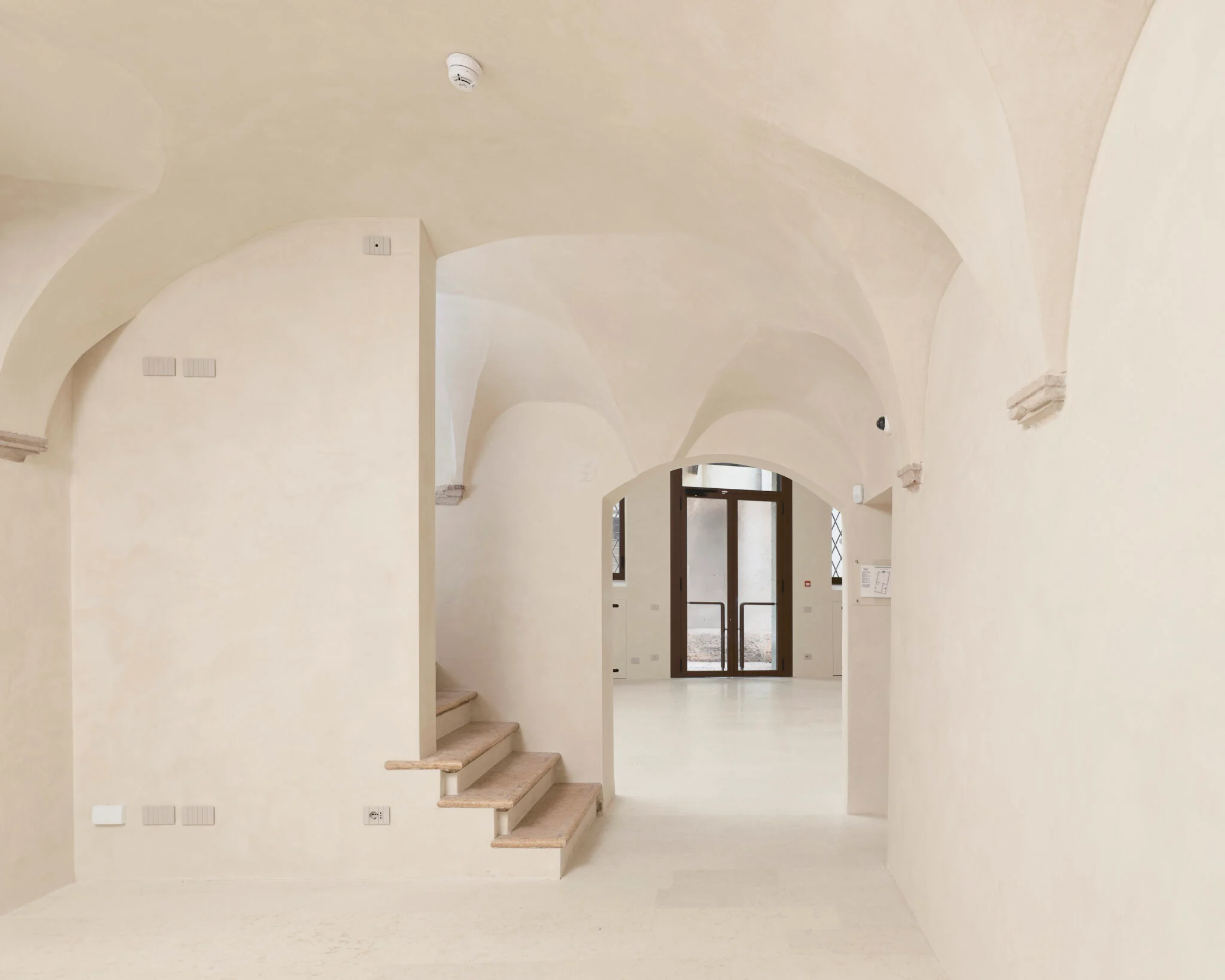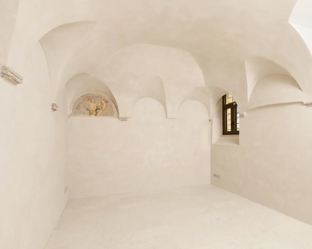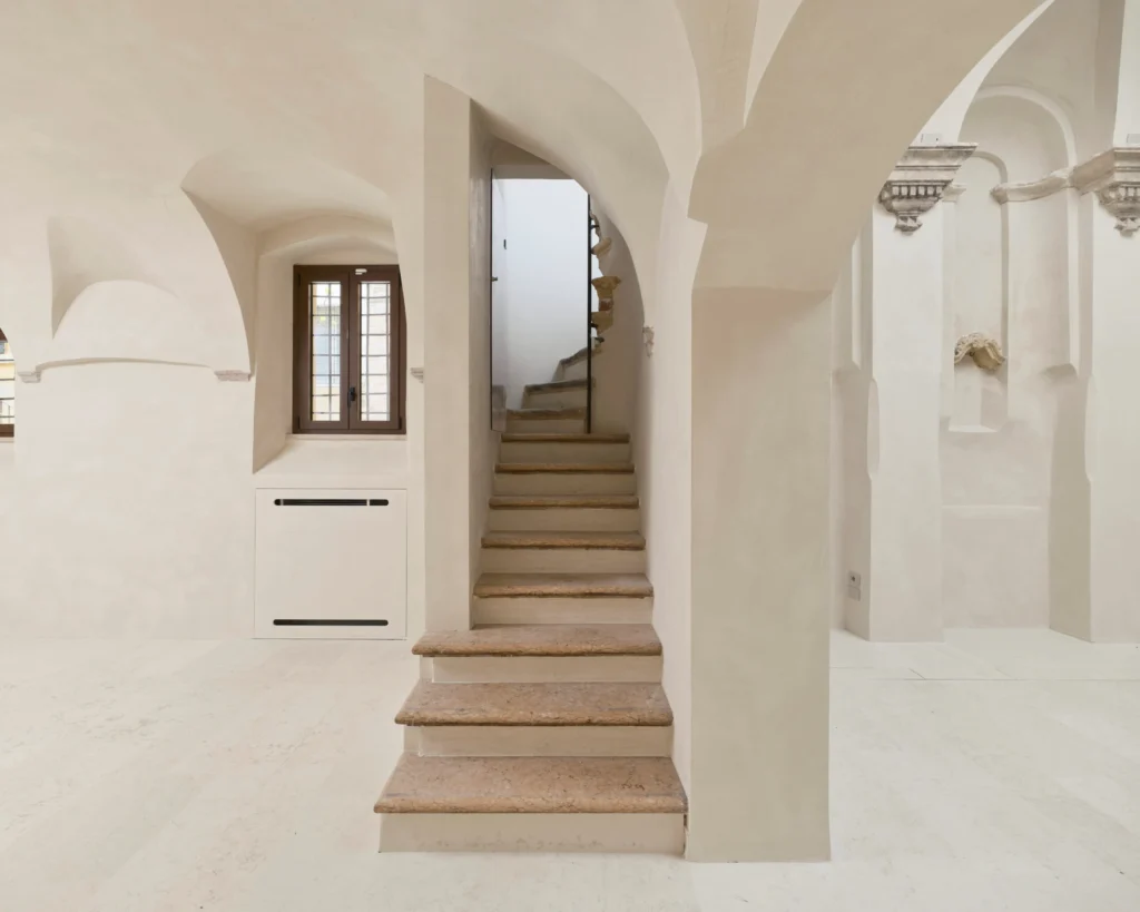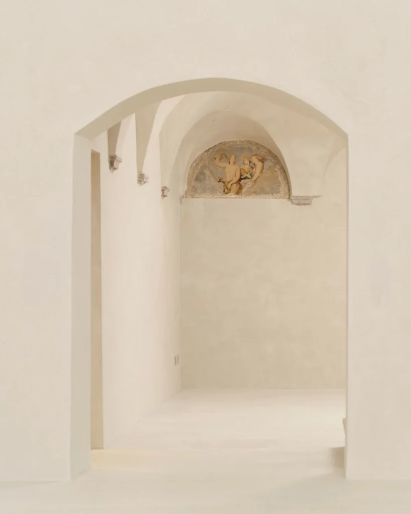 The intervention is defined by a refined and respectful approach. Careful restoration has brought to light original architectural elements, including fragments of frescoes, vaulted ceilings, and engaged columns, restoring clarity and dignity to a space rich in material character. The design avoids ostentation, instead enhancing the intrinsic qualities of the site and preserving its intimate essence.