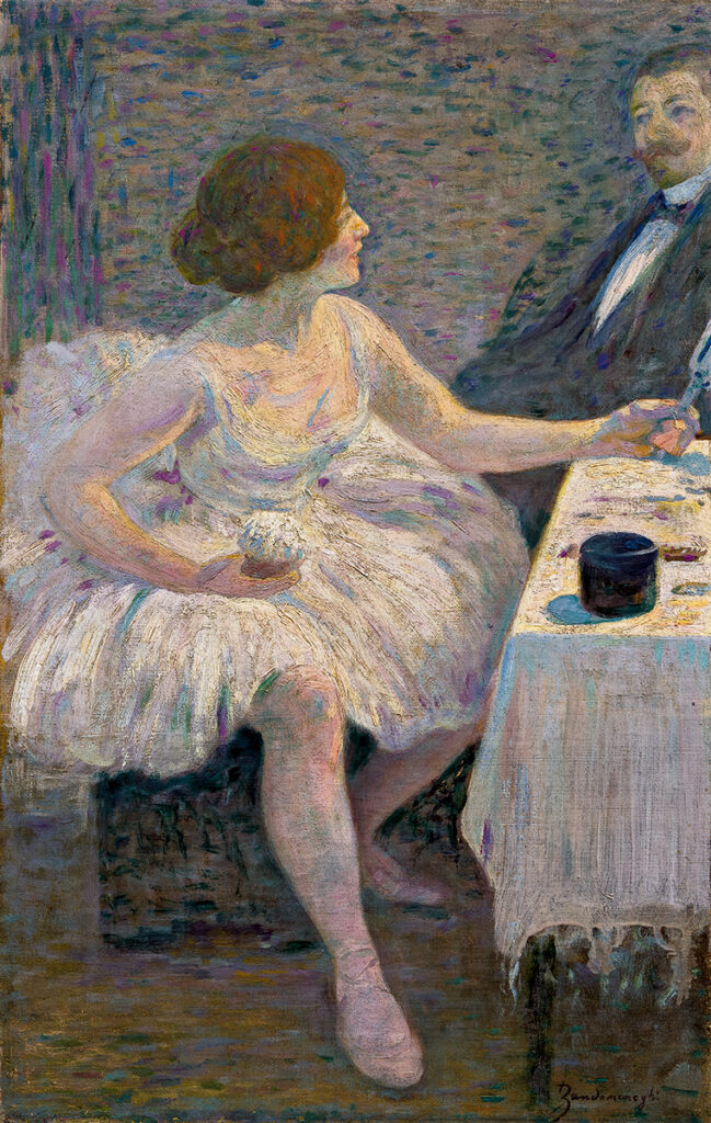 Ma il vero cuore della mostra è il dialogo visivo tra le opere: le celebri ballerine e i nudi di Degas sembrano specchiarsi nelle scene di vita quotidiana di Zandomeneghi, come il celebre Al caffè Nouvelle Athènes o il raffinato Visita in camerino. Qui, la pittura abbandona la retorica dei grandi temi storici per concentrarsi sul gesto minimo, sull’intimità di una donna che si pettina o sul riflesso di un cucchiaino in un bar parigino.